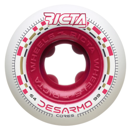 Ricta Wheel Dynamics 54mm Wade Desarmo Pro Cores 99a white with red core and metallic pad printed graphic.